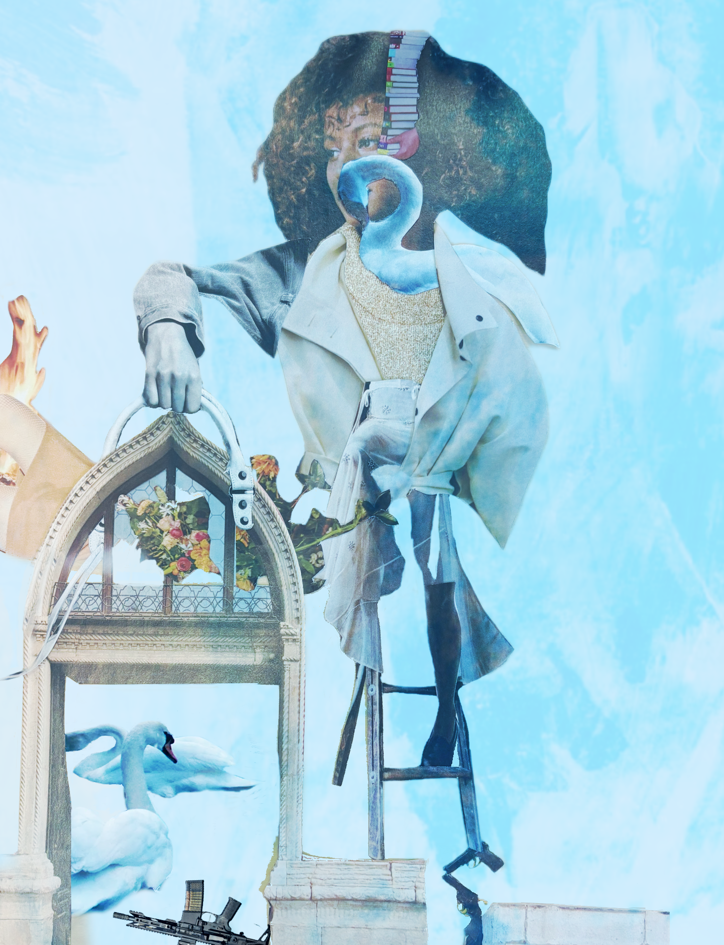 She stands at the center of contradiction and control- her body part human, part swan, poised between beauty, burden and resistance. Through Surreal layering the work questions who gets to rise, who burns, and who holds the door closed.