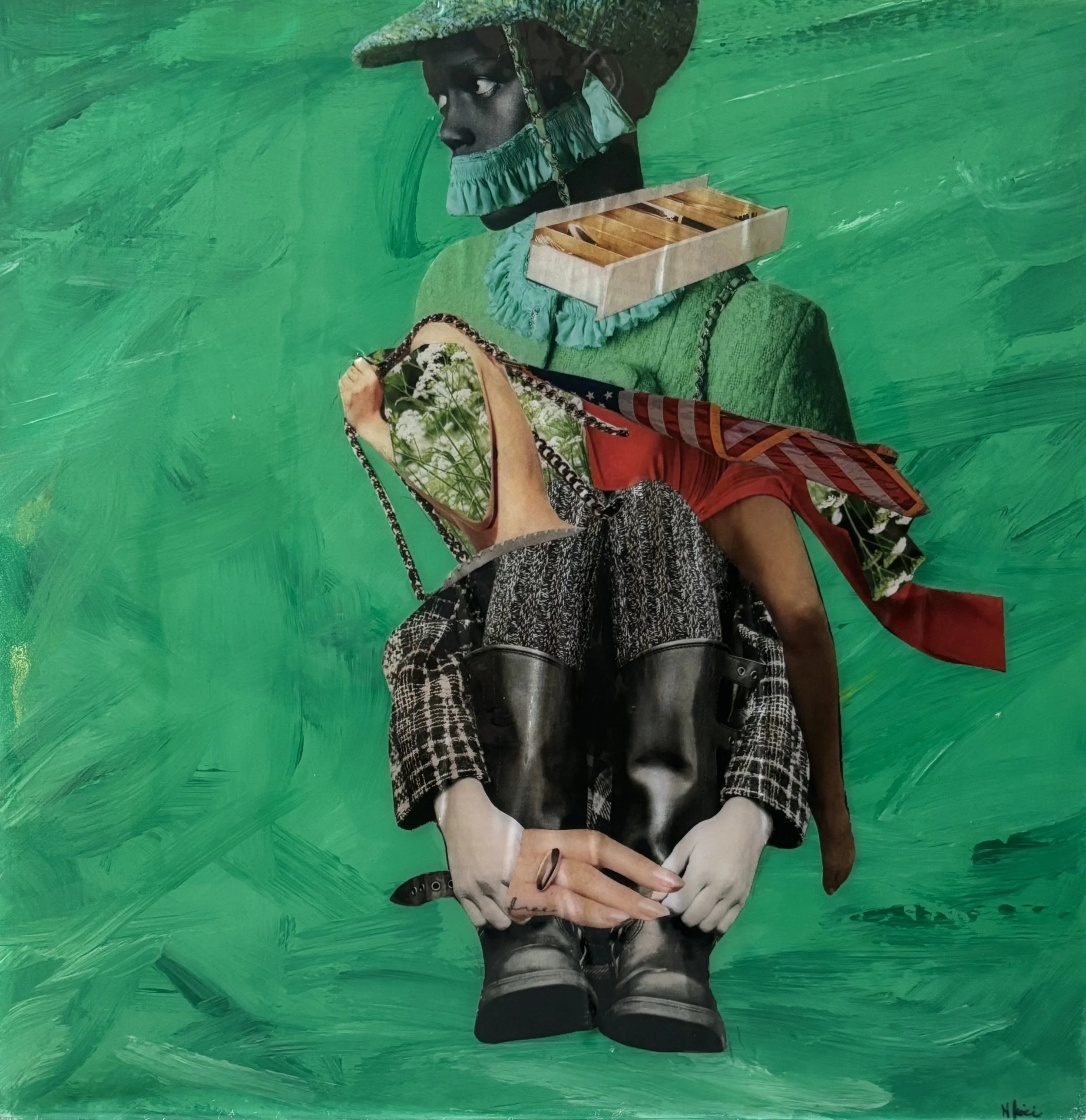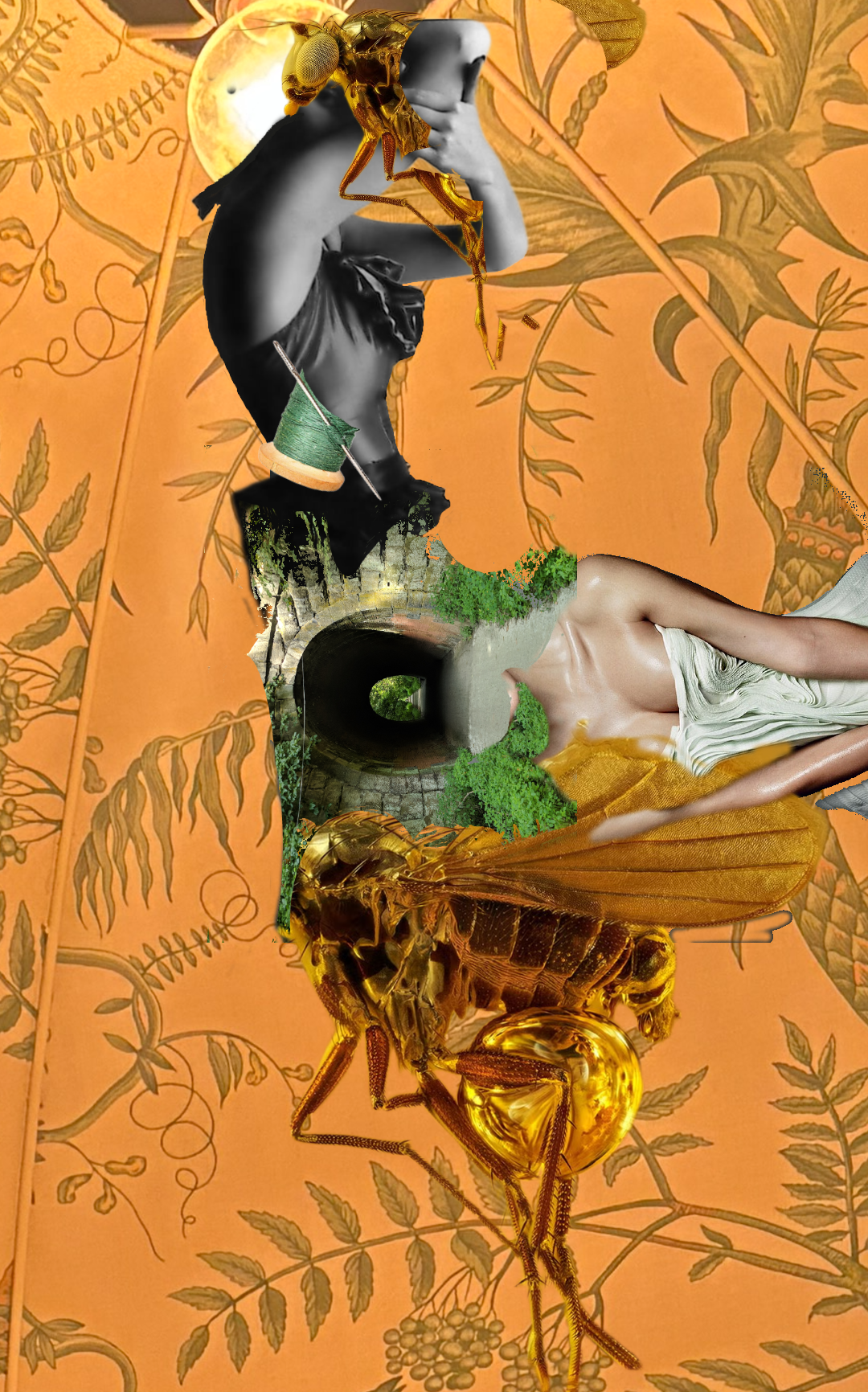 The female body becomes both creator and creation—stitched, spliced, and remade. With bee limbs and a lightbulb skull, she embodies labor & illumination, shielding her face in quiet defiance. Against an amber ground, the collage reflects on motherhood, body image, and the fragile stitching that holds women together.